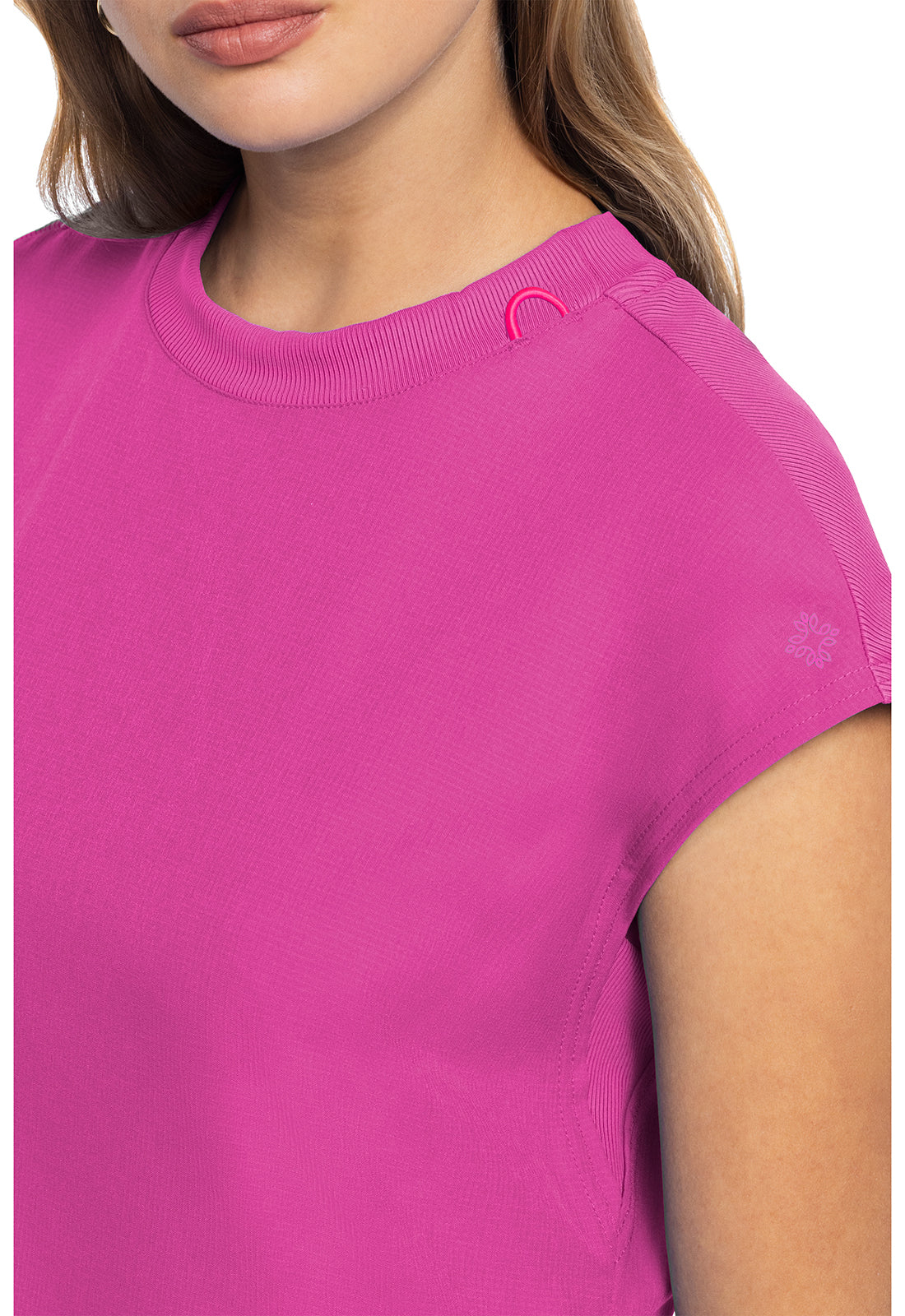 Trend alert: this Missy fit round neck tuckable top is filled with fashionable details such as dyed-to-match rib-knit neckband trim plus dolman sleeves with rib-knit insets at the armholes. There is also a bungee ID badge loop on the wearer's left side of the neckband. There are two zipper pockets for secure storage: one wireless earbuds pocket at shoulder seam and one side seam pocket on the wearer's left side. The dyed-to-match rib-knit back yoke provides style and fit. A locker loop is placed below the back yoke for quick hanging. A rounded hem completes the look. Cent back length: 25"