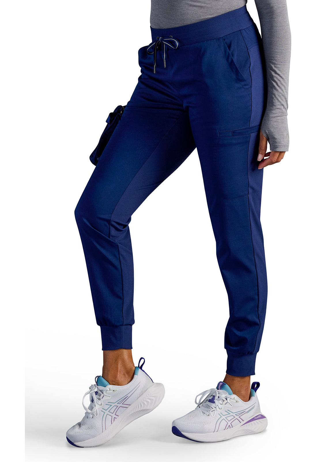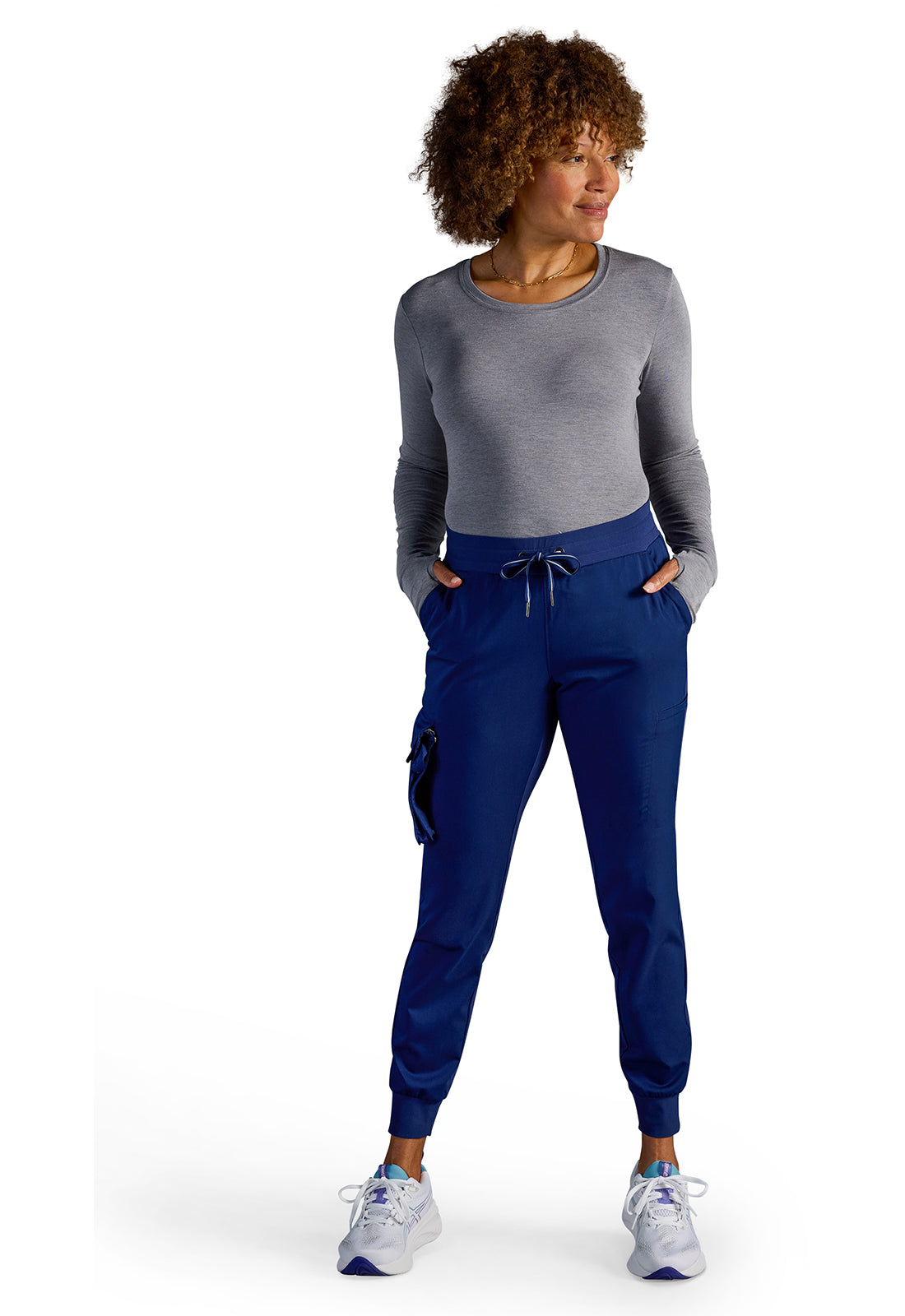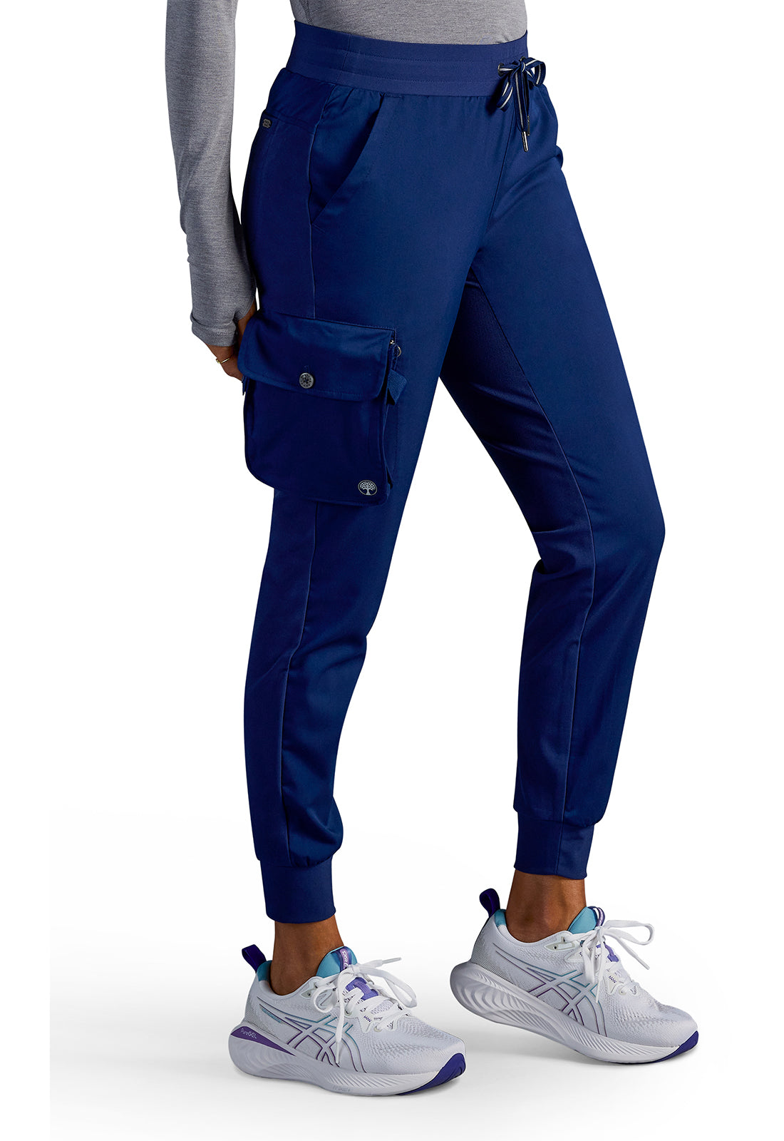 Soft woven scrub fabric on the front plus a stretchy full knit back equals one very fashionable scrub jogger. This pant also has a unique detail: a detachable pocket for on-the-go storage. The Healing Hands x Dr. Kwane Vanessa mid rise scrub jogger features a mock fly plus an elasticized waistband with a drawstring for adjustability and security. There are seven pockets for organized storage: two front slant pockets, two welt cargo pockets, and two back welt pockets. Detachable pocket on wearer's right side converts into a bag. A back yoke provides a better fit. The mixed media styling continues with dyed-to-match knit back panels and knit cuffs. Modern fit. Tapered jogger leg, 8 3/4" leg opening. Inseam: 28 1/2"