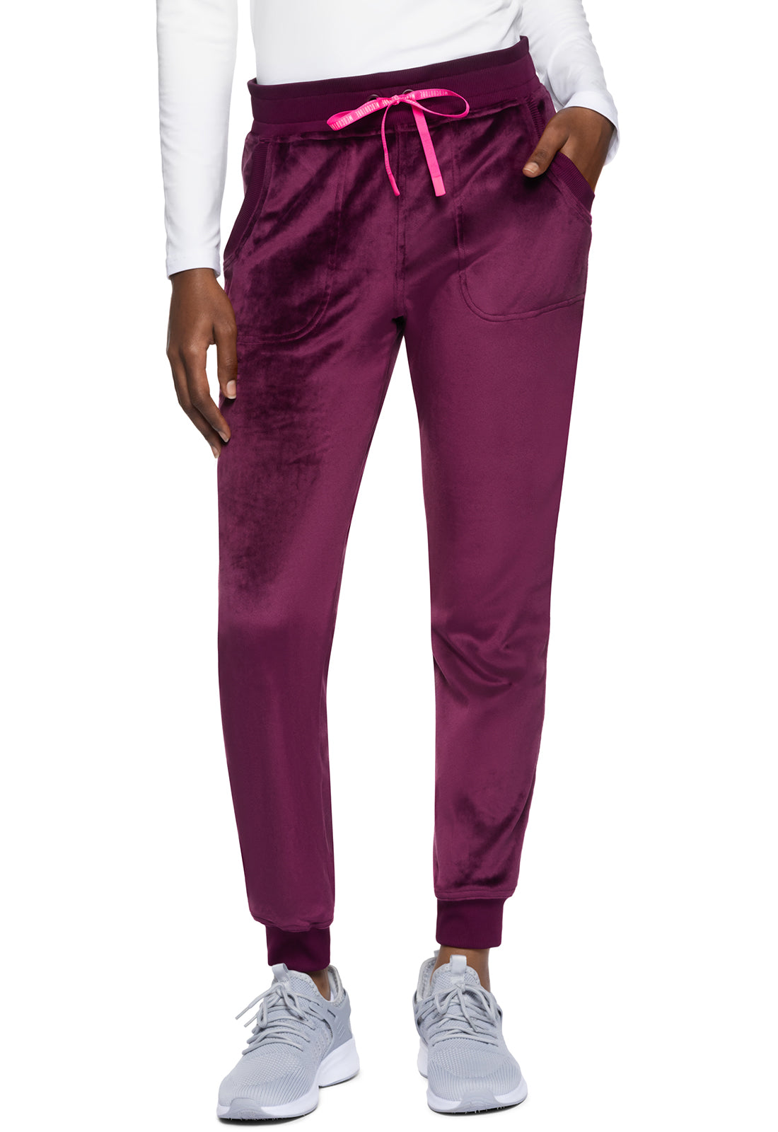 Comfort meets style with this trend-right Velour Natural Rise Jogger. The elastic reinforced rib-knit waistband features an adjustable pink logo drawstring while a pink logo locker loop on the back waist offers a quick storage option. The two front pockets and cuffs boast tonal rib-knit trim. Look for the matching Velour Zip Front Logo Hoodie (sold separately) to complete the outfit. Missy fit. Tapered jogger leg, 9" opening. Inseam: 28 1/2"