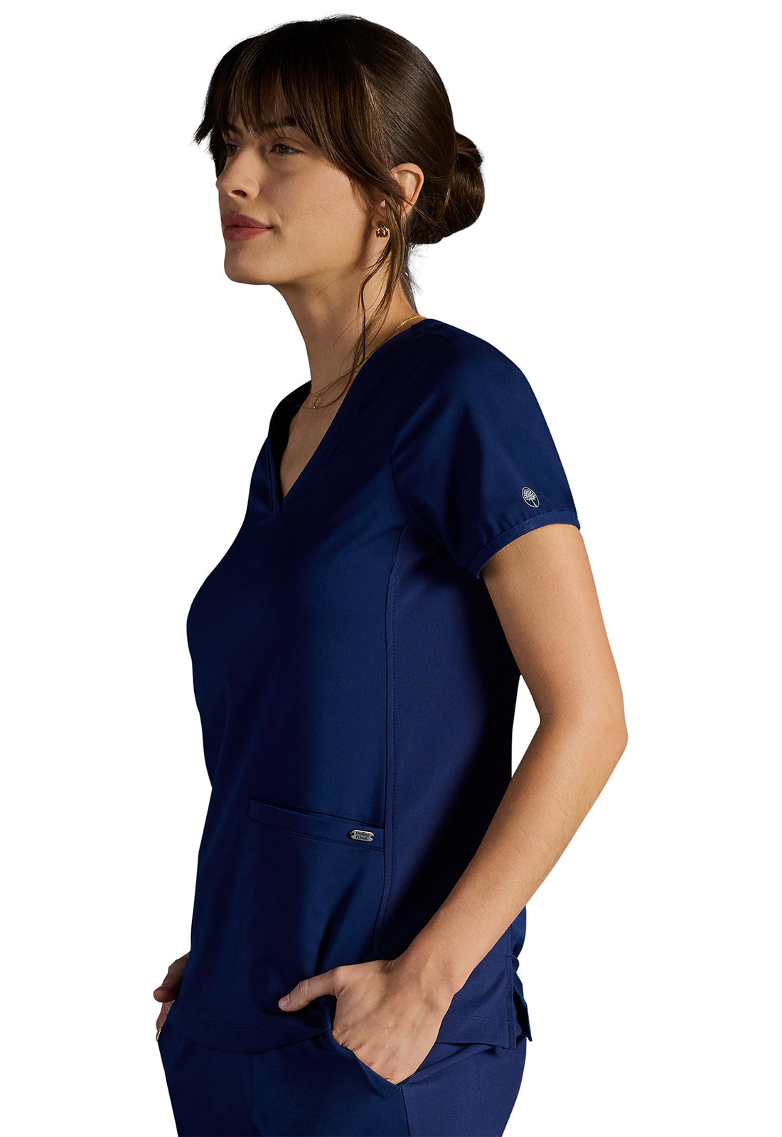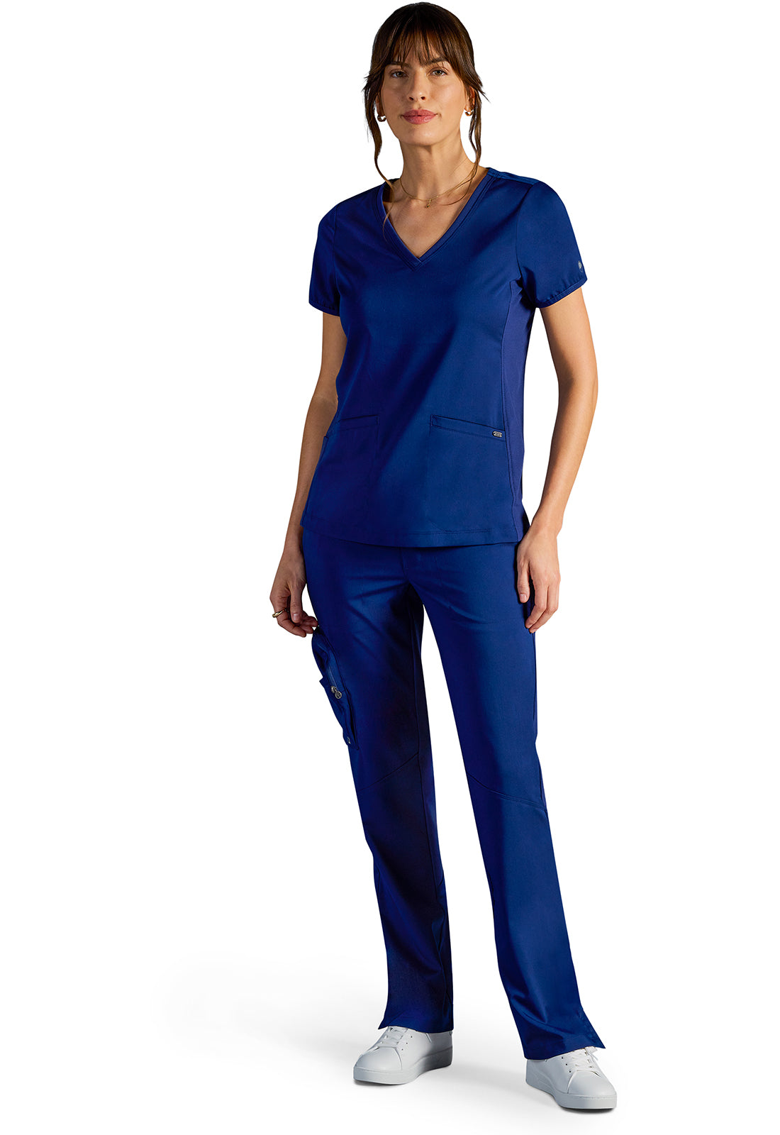 • Comfort and style combine in the Vivian v-neck top from Healing Hands x Dr. Kwane. Dyed-to-match knit trim on neck band plus stylish and stretchy dyed-to-match knit side panels. There are four pockets for organized storage: two welt pockets, one hidden media pocket on the wearer's left side, and one right hip pocket. Hidden media pocket includes dyed-to-match knit trim at top of pocket. Sleeve hems are finished with elasticized cuffs. Front and back princess seams for fit and shaping. Back darts provided added fit while back vents provide ease of movement. Modern fit. Center back length: 25"