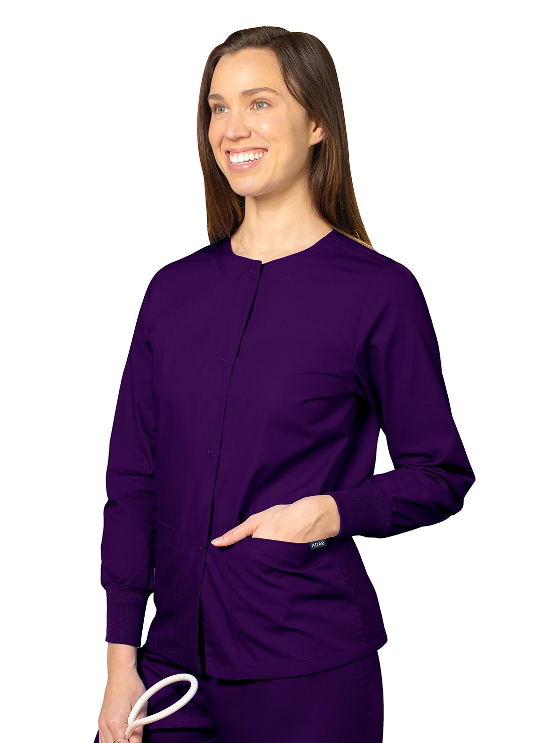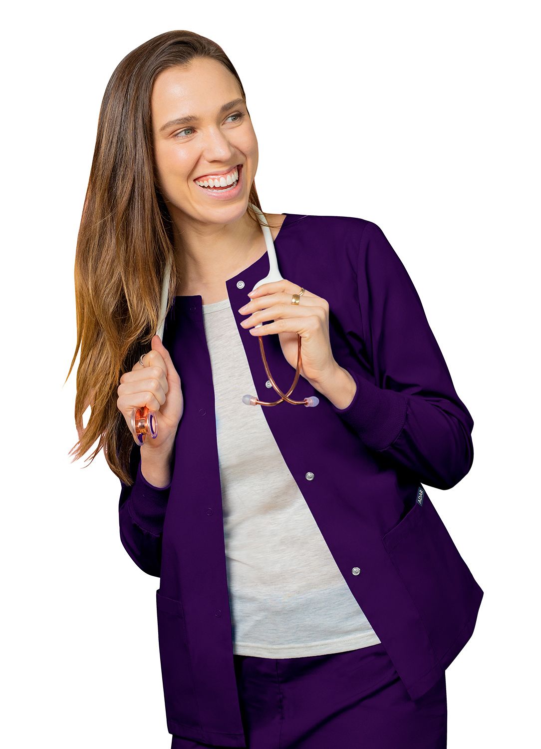 Spiff up a simple pair of scrubs or get an extra layer against the air conditioning. Our round neck warm-up jacket are roomy enough to fit comfortably over scrubs, yet look sleek and put together worn over a t-shirt. Stitched neckline, four snap-front closure and knit cuffs. Center back length 29"