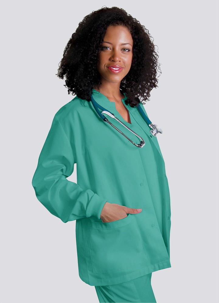 Spiff up a simple pair of scrubs or get an extra layer against the air conditioning. Our round neck warm-up jacket are roomy enough to fit comfortably over scrubs, yet look sleek and put together worn over a t-shirt. Stitched neckline, four snap-front closure and knit cuffs. Center back length 29"